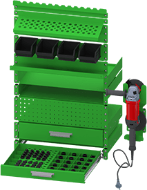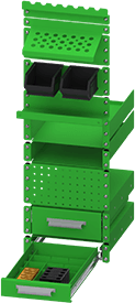 ![]() | This wide drawer accessory package can be used on the MOD-WELD cart along with the center location on the side carts. It is for the organization of the student, this can also be used to teach the student the 5S principles of where tools go and how that can benefit them when employed. Includes: 2-1/2" shallow drawer, 4" deep drawer, Tall Pegboard panel, Storage shelf, Clamp hanger rail, Fixture setup pin rail, 45 places, Spray can shelf, Bin box panel, Drawer divider set, pin tray, & angle grinder hanger with cord wrap. (grinder and set-up pins not included) | ![]() | This narrow drawer accessory package can be used on the side cart's two narrow locations only. It is for the organization of the student, this can also be used to teach the student the 5S principles of where tools go and how that can benefit them when employed. Includes: 2-1/2" shallow drawer, 4" deep drawer, 6" Tall Pegboard panel, Storage shelf, Clamp hanger rail, Fixture setup pin rail-21 places, Spray can shallow shelf, Bin box panel, 2 bins (4-1/8" x 5-3/8" x 3"), & Drawer divider set. (set-up pins not included) | ||||